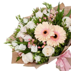 • Стандарт - роза - 5 шт., альстромерия - 5 шт., зелень, упаковка, лента
