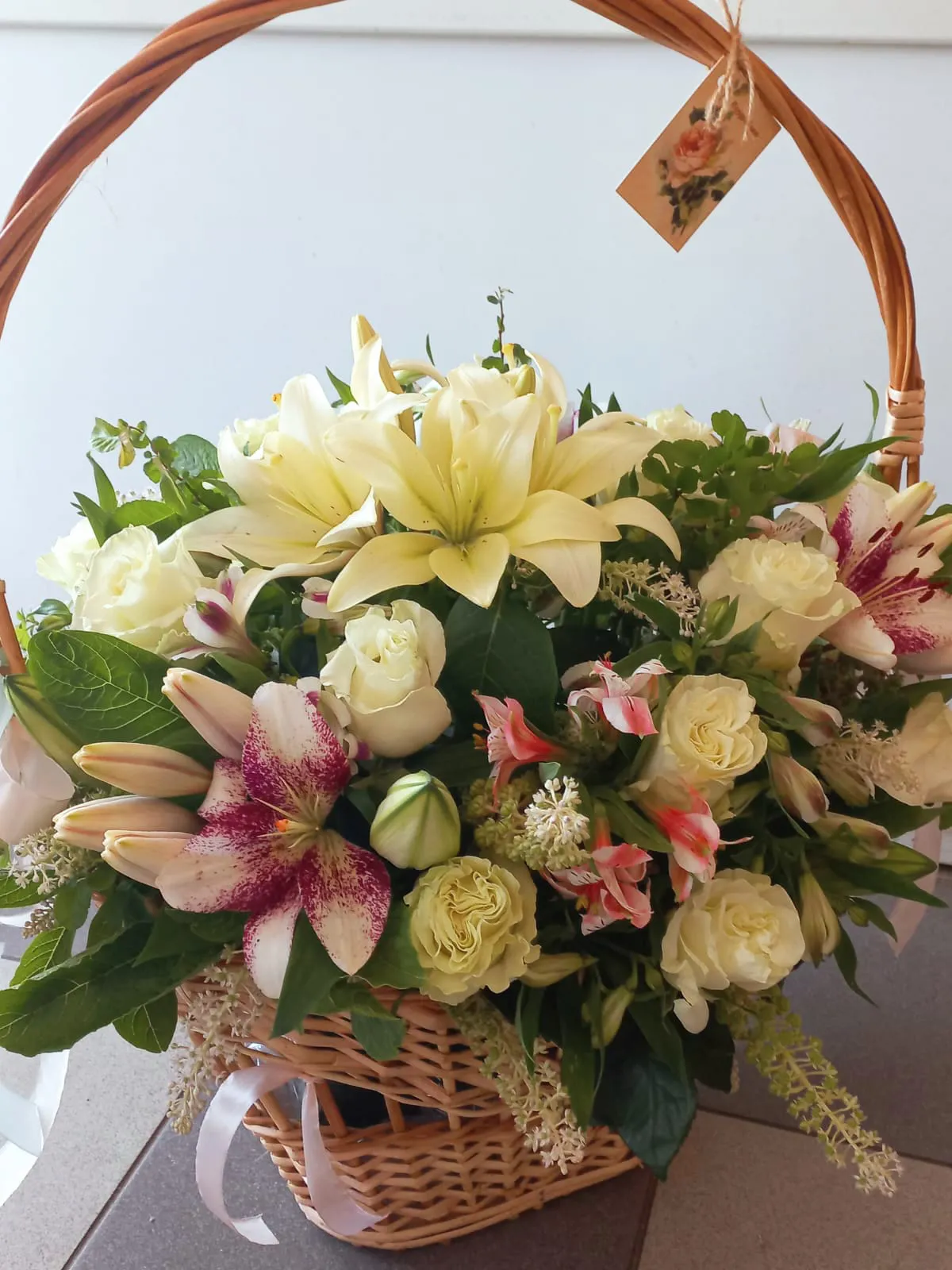Вариант—Стандарт - розы - 5 шт, альстромерия - 6 шт, лилии - 3 шт, кустовая роза - 3 шт, оазис, корзина.