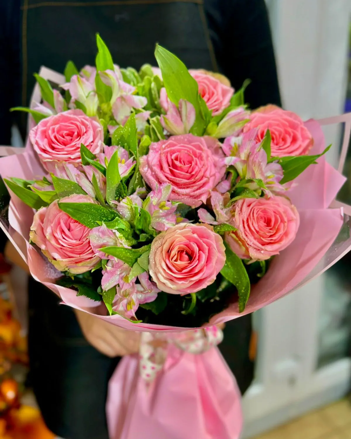 Все это великолепие аккуратно упаковано в мягкую розовую бумагу, которая обволакивает цветы, подчеркивая их красоту и придавая композиции стильный вид. Зелень, добавленная к букету, придает ему естественности и свежести, создавая контраст с нежными оттенками роз и альстромерий.