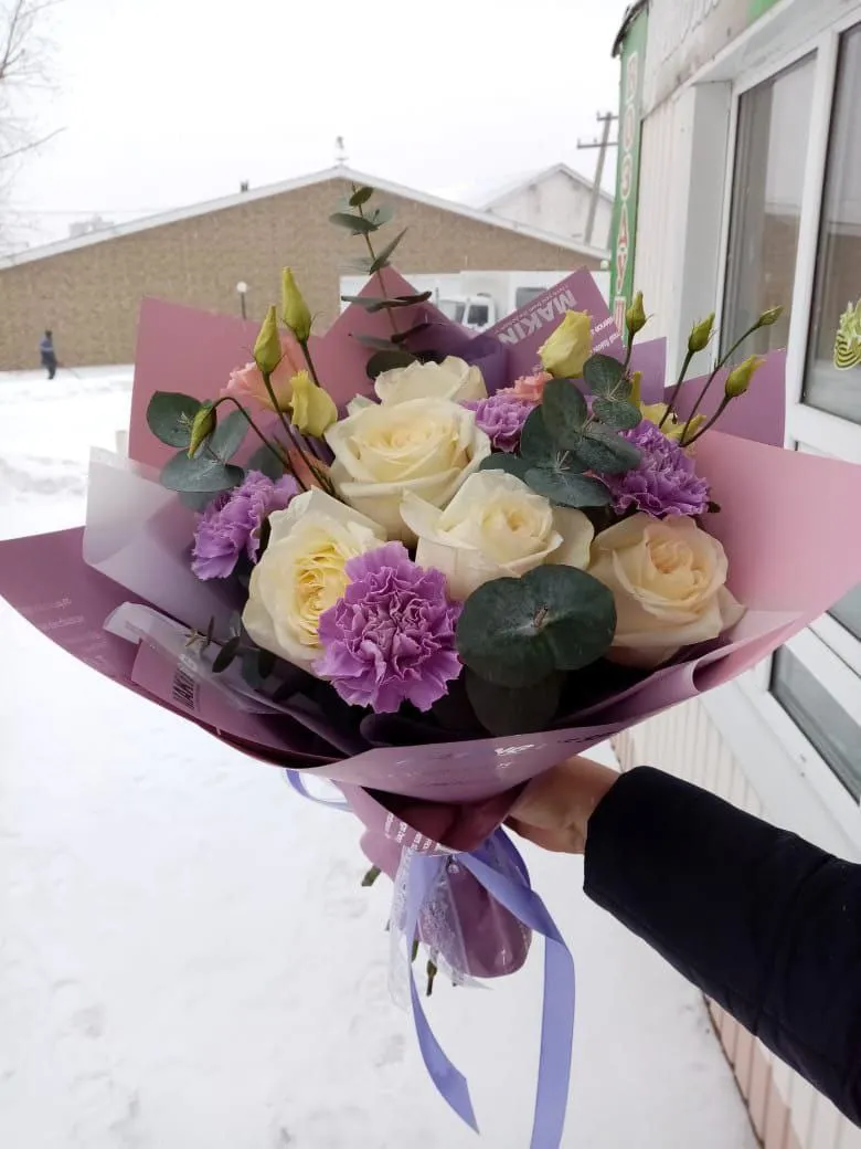 Собранный букет из роз, гвоздик и эустом — это истинное воплощение красоты и гармонии. Каждый цветок в этом изяществе по-своему уникален и в то же время создает невероятный ансамбль.