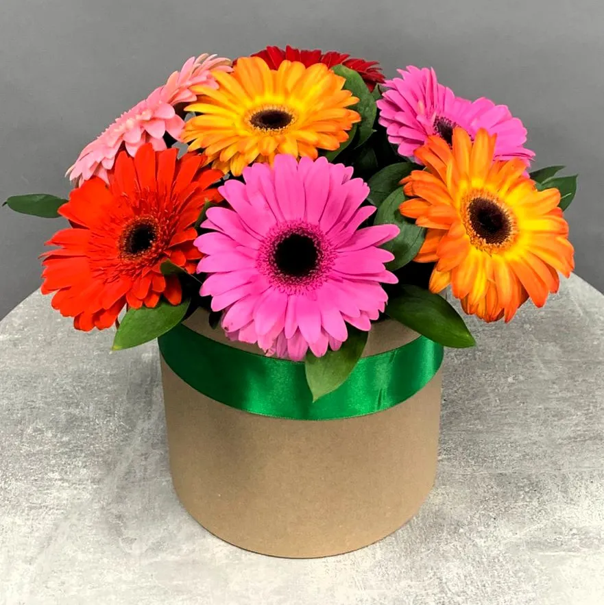 Герберы в шляпной коробке: Взрыв ярких красок и океан позитива!