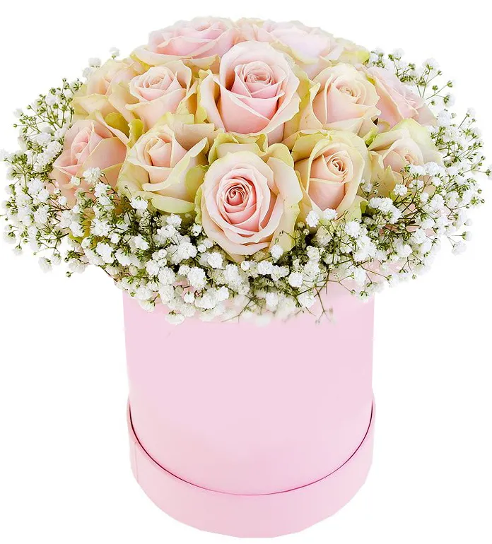 Состав: розы, гипсофила, оазис, шляпная коробка