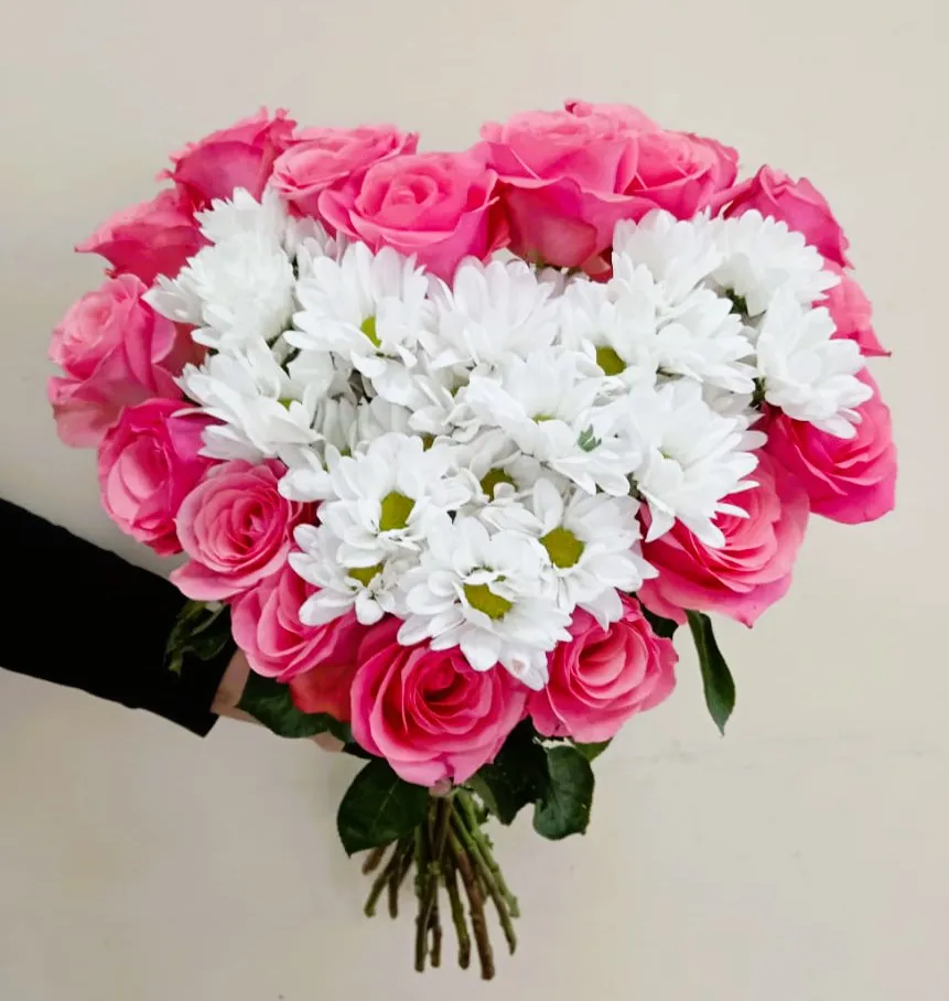 Очаровательный букет, составленный из изысканных розовых роз и нежных ромашковых хризантем, восхищает своим великолепием и очарованием. Каждая роза, словно нежный лепесток любви, утопает в мягком пастельном оттенке, а их бархатистая текстура создает ощущение легкости и романтики. Ромашковые хризантемы, с их яркими белыми лепестками и солнечными желтыми серединками, добавляют живости и игривости в композицию.