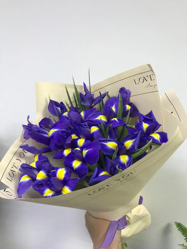 Синие ирисы – универсальные цветы, дарятся и женщине. Ирисы символизируют  искренность и доверие.  Подарить можно другу, коллеге или члену семьи, повод не важен – эмоции точно будут положительными.
