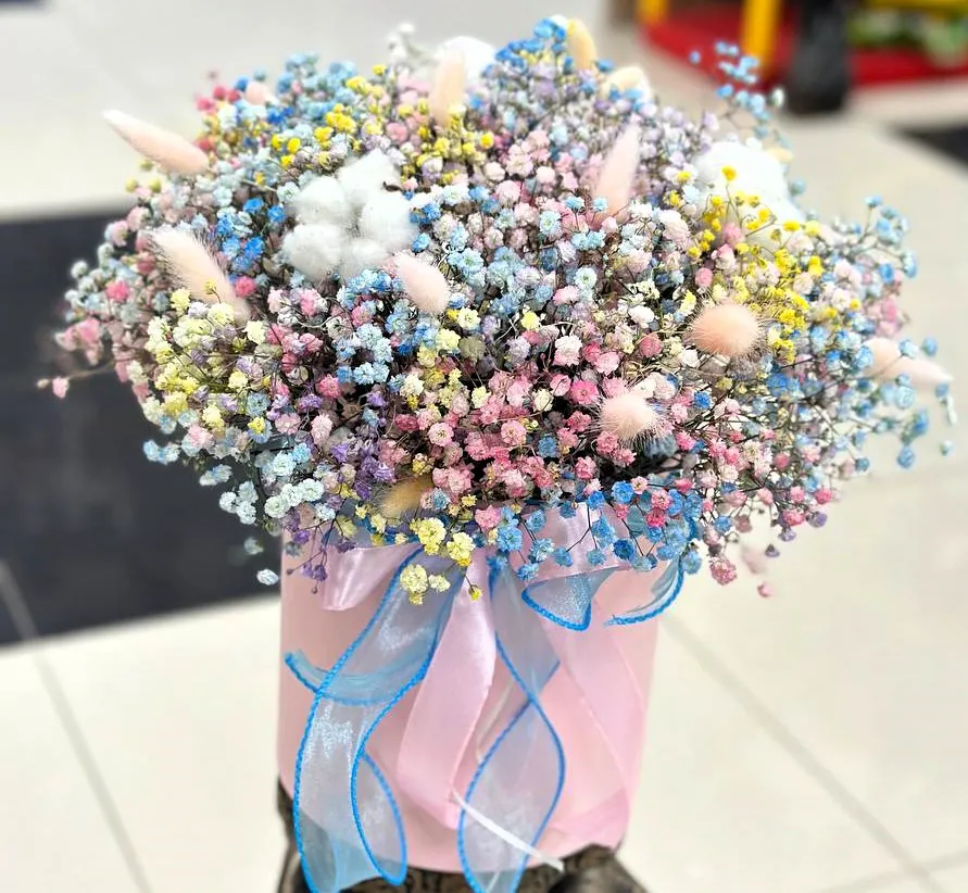 Радужная гипсофила, хлопок, шляпная коробка, оазис