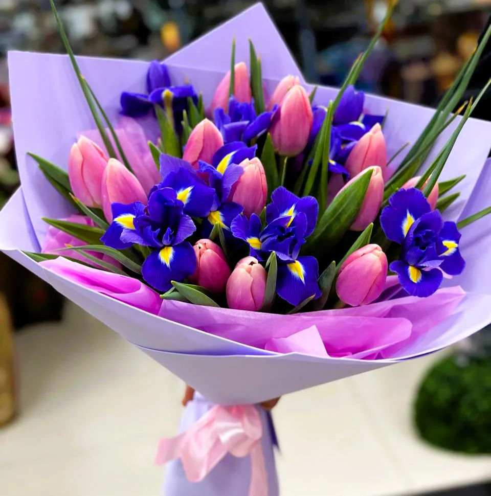 Букет из розовых тюльпанов и ирисов — это настоящая симфония весенней красоты и нежности