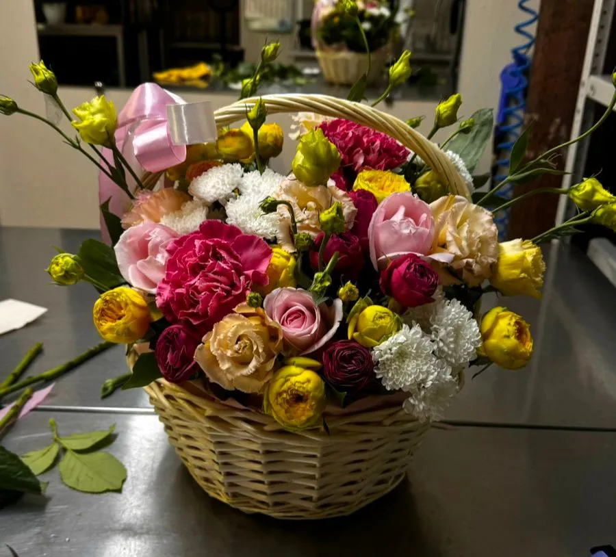 Все эти цветы искусно уложены в плетеную корзину, которая сама по себе является украшением, а нежный розовый бантик завязывает всю композицию, придавая ей завершенность и очарование