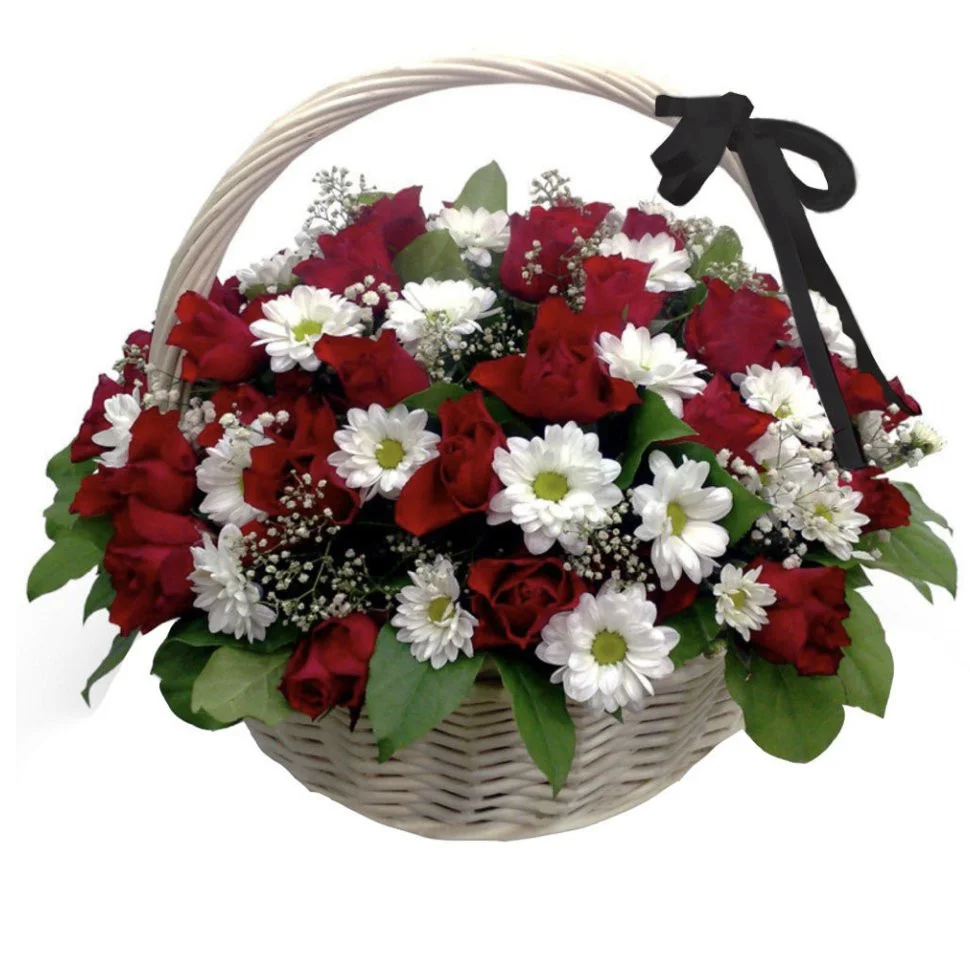 —Траурная корзина из красных роз и белых хризантем