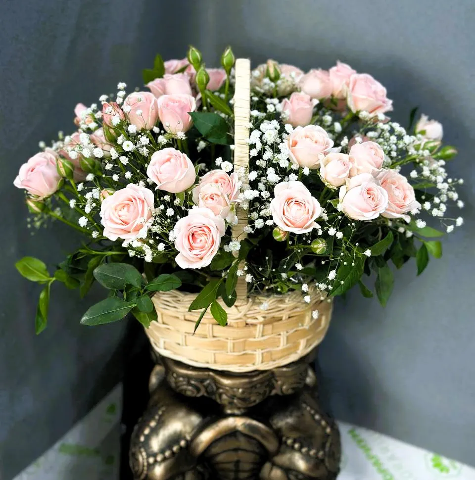 Корзина с розами и гипсофилой — это симфония нежности и элегантности, которая станет прекрасным подарком для любого повода.