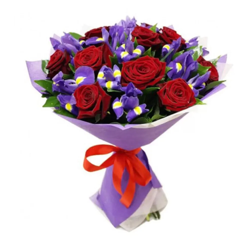 —Букет из красных роз и ирисов Вечерний карнавал