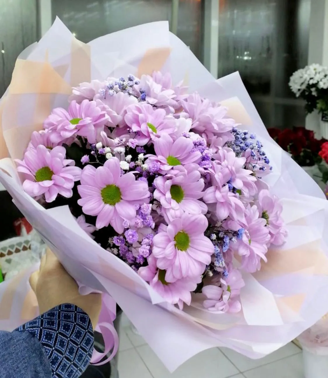 • Средний кустовая хризантема - 7 шт., гипсофила, упаковка, лента