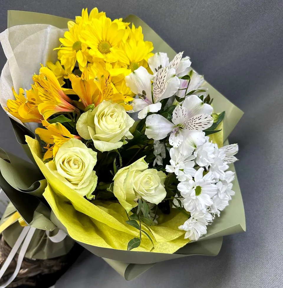 Яркий и восхитительный букет из роз, альстромерий и хризантем в жёлтых тонах — это великолепный подарок, способный поднять настроение и украсить любое мероприятие. Каждое цветочное составляющее этого букета приносит свою уникальную энергетику: нежные розы символизируют любовь и олицетворяют красоту, а яркие альстромерии добавляют свежести и игривости. Хризантемы же с их роскошными формами и насыщенным жёлтым цветом привносят в композицию тепло и радость.