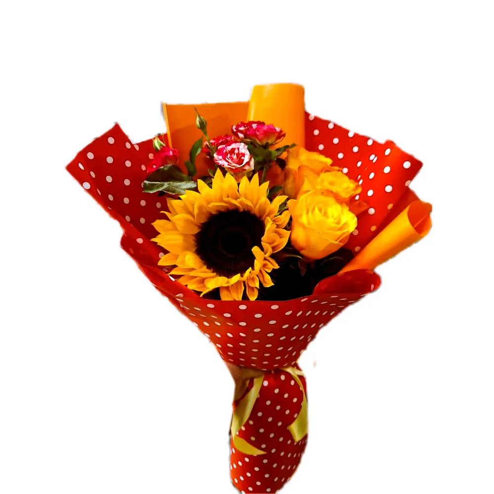 - Стандарт - роза - 3 шт., кустовая роза - 1 шт., подсолнух - 1 шт., зелень, упаковка, лента